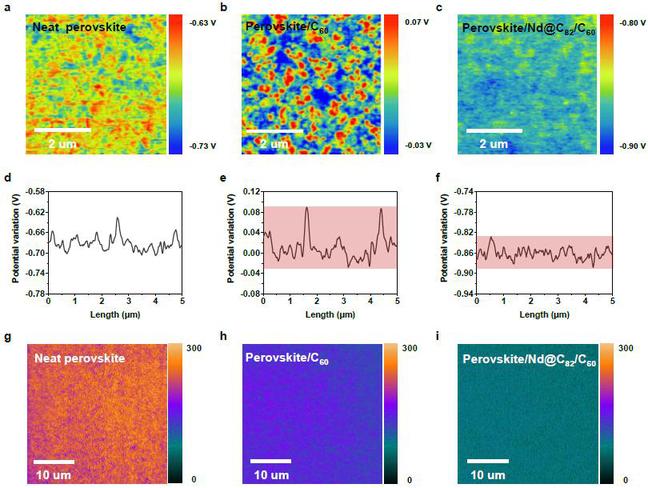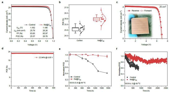 该研究阐明了富勒烯Nd@C82在钙钛矿太阳能电池界面产生永久强电场,增强电荷分离和提取的作用机制,提出了构建金属富勒烯-聚合物耦合互穿网络新策略。基于上述策略优化后的钙钛矿太阳能电池实现了26.78%的能量转换效率,在标准工作状态下进行最大功率点跟踪,运行2500小时后依旧维持着82%的初始性能,相较于此前的报道有着显著提升,为制备性能和稳定性兼优的钙钛矿太阳能电池提供了新思路。值得注意的是,本研究得到了新葡的京集团350vip8888官网欧阳新华教授领衔的绿色光电器件与储能电池团队的重要支持。