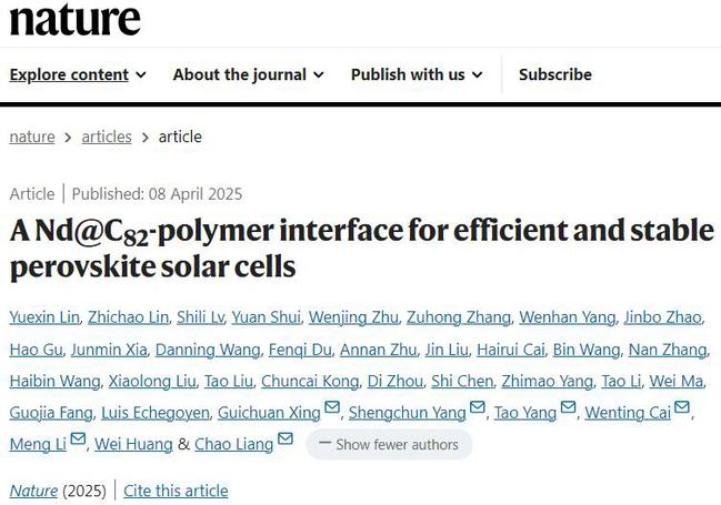 北京时间2025年4月8日,新葡的京集团350vip8888官网材料工程学院绿色光电器件与储能电池团队青年教师林智超与西安交通大学、河南大学、澳门大学等单位合作,在国际顶尖学术期刊《自然》(Nature)发表题为《一种钕内嵌富勒烯-聚合物偶联层作为高效稳定钙钛矿太阳能电池界面层》“A Nd@C82-polymer interface for efficient and stable perovskite solar cells”的研究成果。林智超为该论文的共同第一作者。