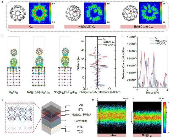 该研究报道了一种磁性金属钕内嵌富勒烯-聚合物(Nd@C82-PMMA)偶联层,该偶联层通过界面极化,增强了电子提取效率,同时兼具原位封装和超快电子提取的特点,在促进电子高效传输的同时,抑制了离子扩散,保护了钙钛矿层免受水和氧气的侵蚀,助力效率和稳定性的同步提升。