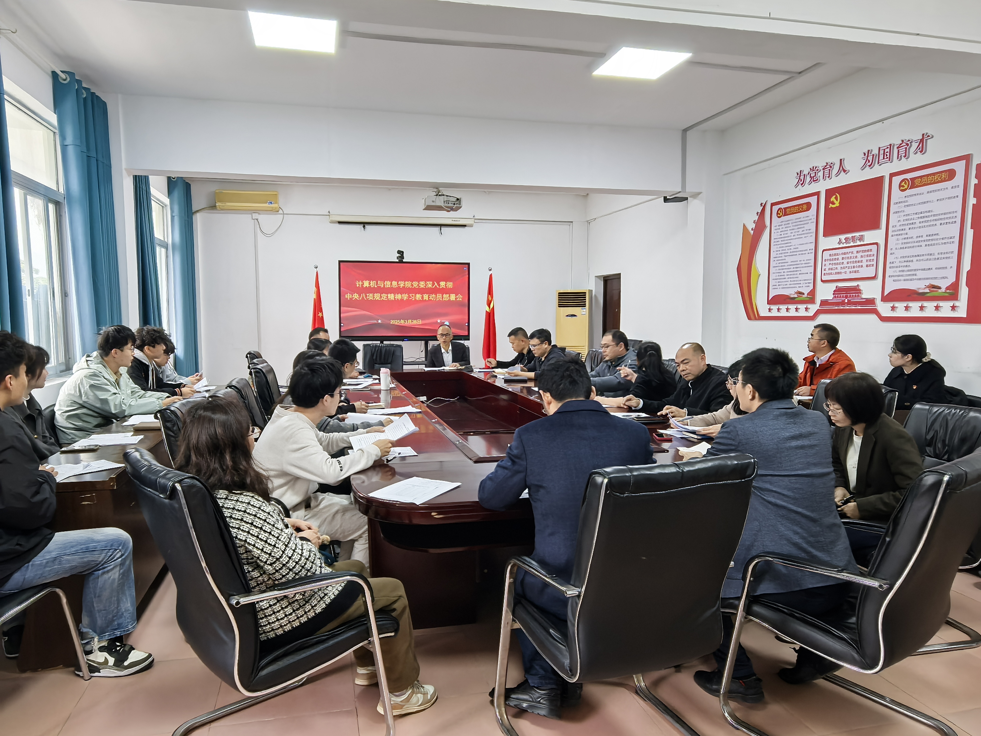 3月28日下午,计算机与信息学院党委召开深入贯彻中央八项规定精神学习教育动员部署会。院党委书记钟一文主持会议并讲话,学院党政领导、科级干部、党支部书记参加会议。