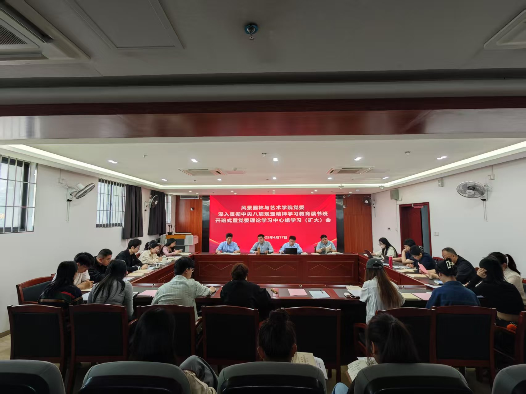 4月17日上午,风景园林与艺术学院党委在旗山校区综合楼1204会议室举行深入贯彻中央八项规定精神学习教育读书班暨党委理论学习中心组学习(扩大)会。会议由院党委书记雷国铨主持,学院领导班子成员、科级干部及各党支部书记参加。