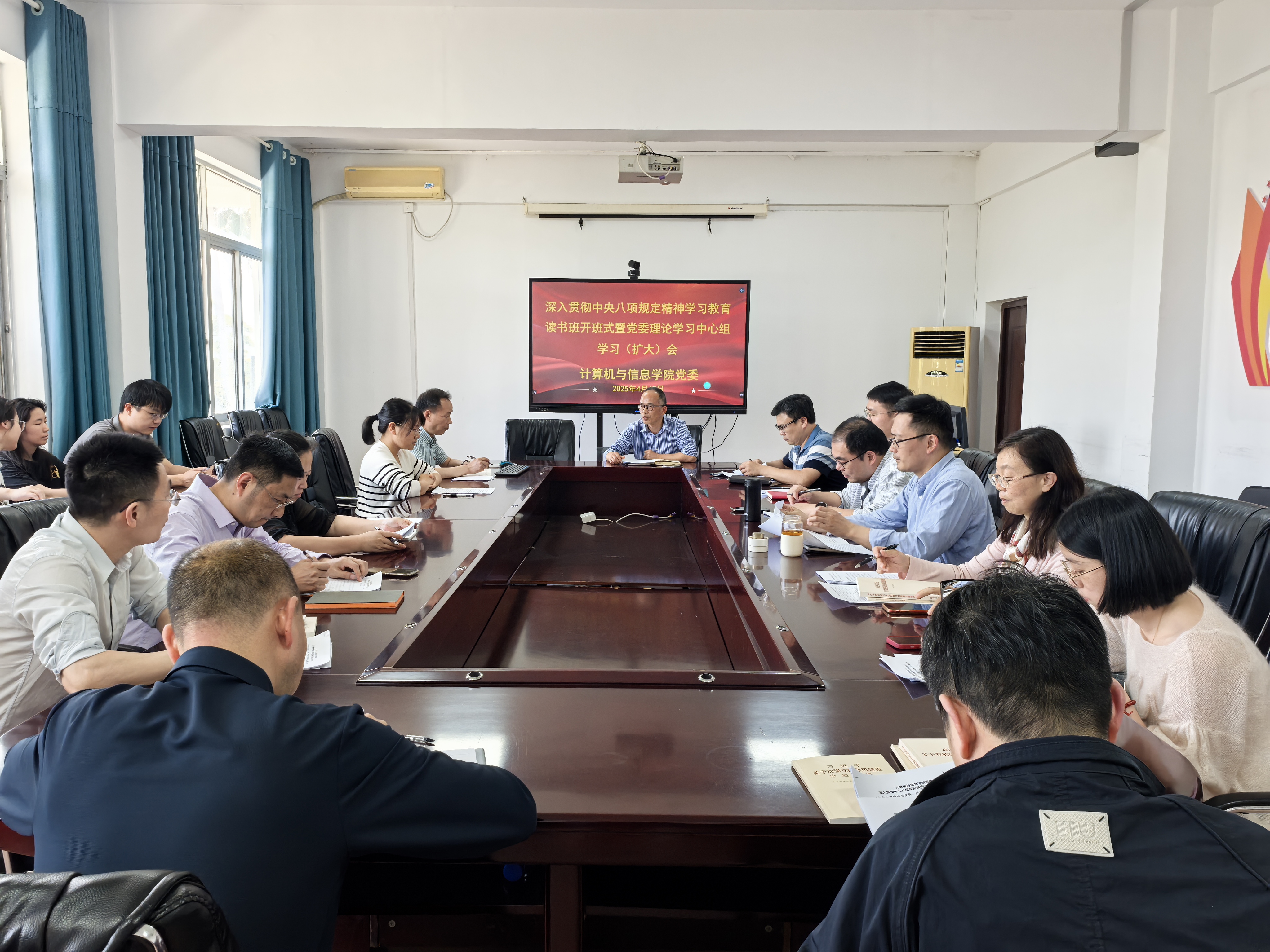 4月17日下午,计算机与信息学院党委召开深入贯彻中央八项规定精神学习教育读书班开班式暨党委理论学习中心组学习(扩大)会。院党委书记钟一文主持会议并讲话,学院党政领导、党支部书记参加会议。