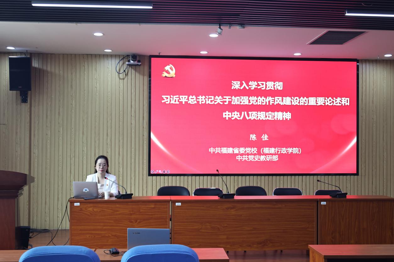 陈佳以“深入学习贯彻习近平总书记关于加强党的作风建设的重要论述和中央八项规定精神”为题,围绕习近平总书记关于加强党的作风建设的重要论述、中央八项规定及其实施细则精神、深入贯彻中央八项规定精神的成效和经验、一体推进“学查改”四个方面,并结合大量的史料、现实资料和鲜活案例,深入浅出地讲解了中央八项规定精神的内涵与实践路径,为参会人员上了一堂生动的教育课。