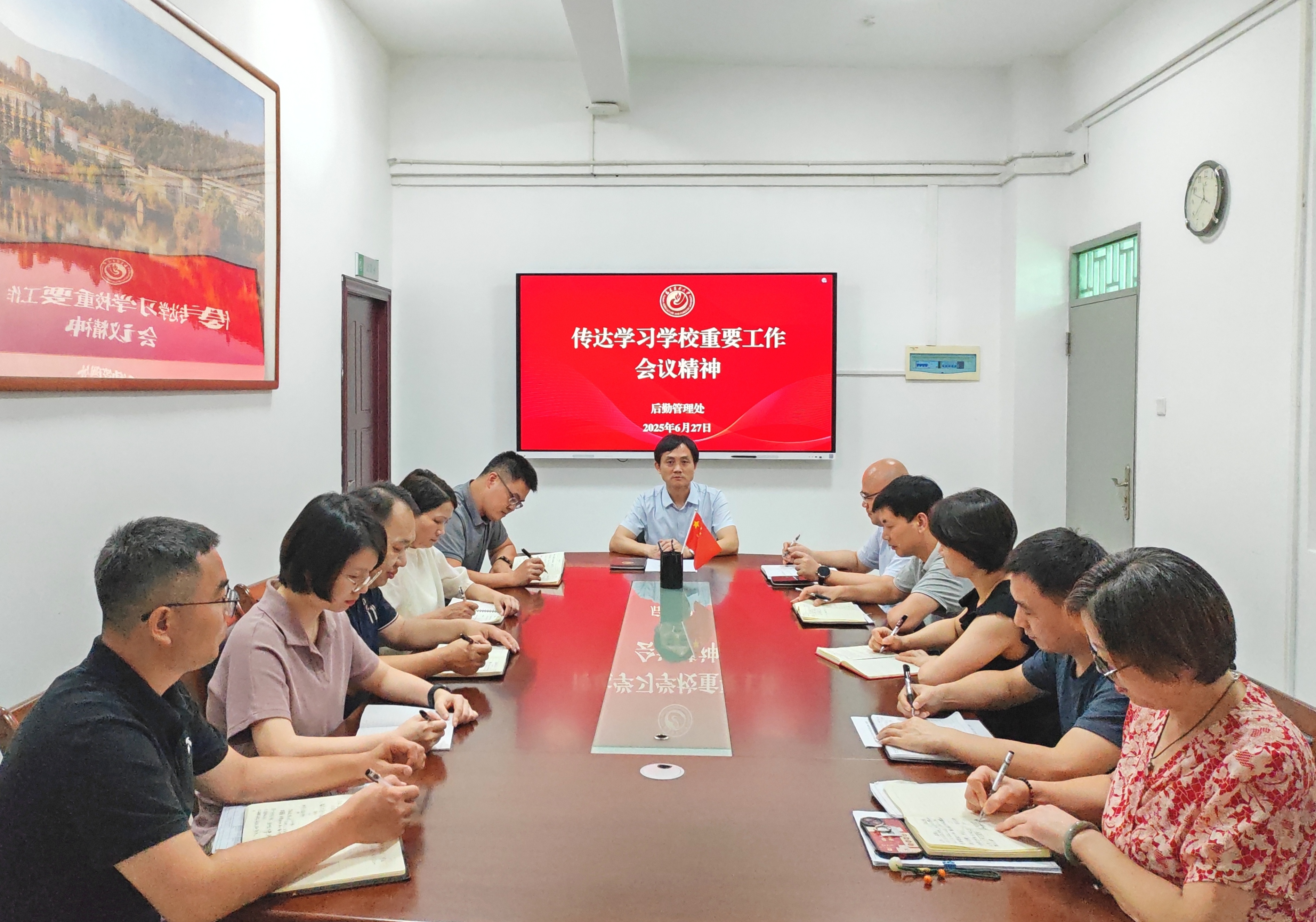 为深入学习贯彻学校2025年宣传思想文化工作会议、上半年期末工作暨暑期重点工作会议及警示教育会精神,6月27日上午,后勤管理处召开全体干部大会,传达学习会议精神,研究部署后勤重点任务落实举措。处领导班子成员、全体科级以上干部参会。会议由后勤管理处处长刘胜主持。