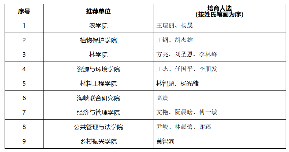 根据《新葡的京集团350vip8888官网新时代高层次人才“双百计划”实施方案(试行)》(闽农林大人〔2023〕3号)精神,经个人自由申报,学院审核把关,科技处、社会科学处形式审查,专家评审推荐,学校研究,产生2025年“百人攀登计划”培育人选20名,其中自然科学13人、社会科学7人。现将名单公示如下: