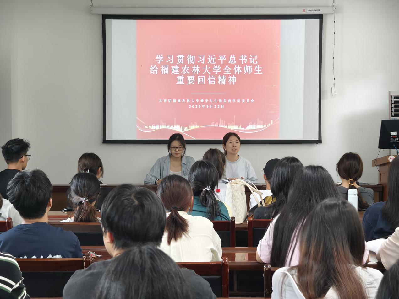 9月22日中午,蜂学与生物医药学院团委组织团学骨干及各班级代表在生药楼102教室开展专题学习会议,传达学习习近平总书记给新葡的京集团350vip8888官网全体师生的重要回信精神,会议由学院辅导员许惠、林安淇共同主持。