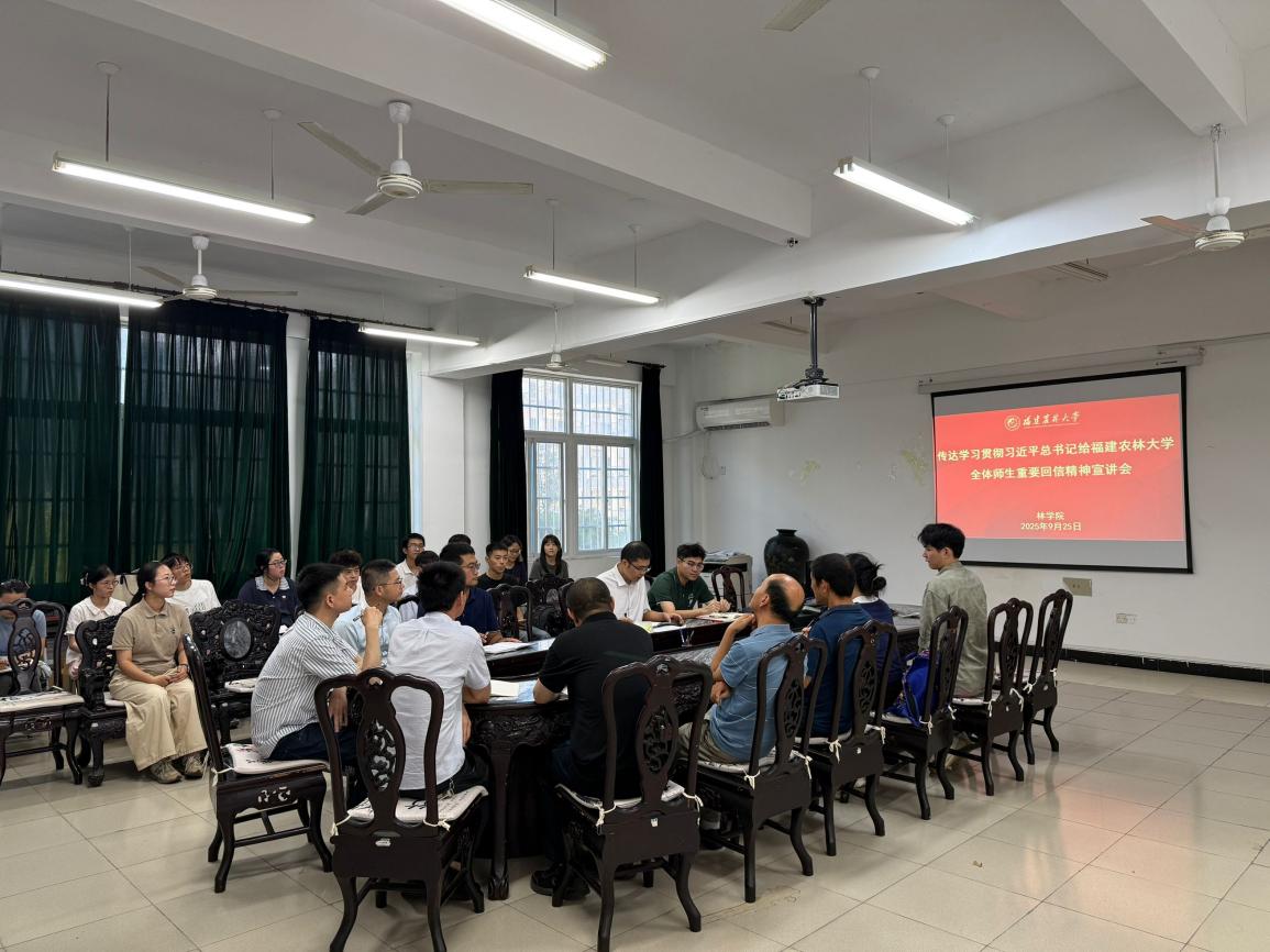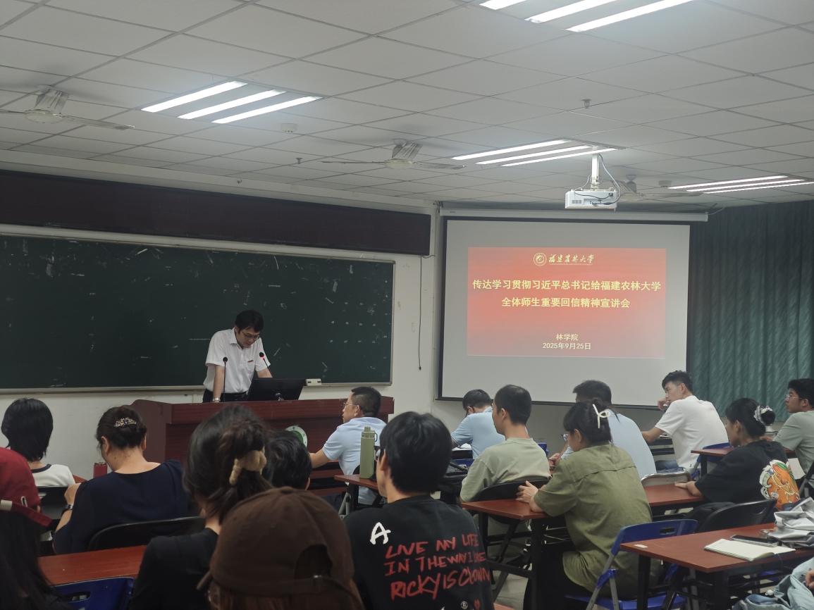 在新葡的京集团350vip8888官网合并组建25周年的重要历史时刻,林学院迅速掀起学习贯彻习近平总书记给全校师生重要回信精神的热潮。9月25日下午,学院党政领导班子分赴各系、实验中心、党支部开展专题宣讲,推动回信精神在基层落地生根。