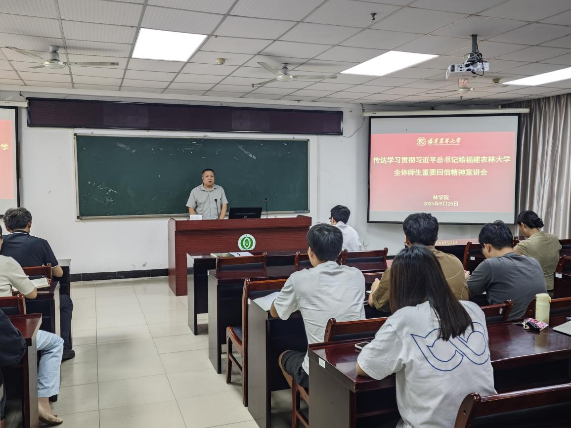 宣讲会上,学院领导班子带领师生重温了习近平总书记重要回信原文,系统传达了省委书记周祖翼莅校宣讲时的讲话精神和校党委提出的六大落实举措。会议强调,要深刻领会总书记对学校发展的殷切期望,把学习贯彻回信精神与践行习近平新时代中国特色社会主义思想紧密结合,与传承弘扬总书记在闽工作期间9次来校调研的重要指示精神有机贯通。学院将紧扣“四个基地”建设蓝图,立足林学、水土保持与荒漠化防治等传统优势学科,培育新兴交叉学科,充分应用好学科群建设机制,推进林学一流学科建设;深化本硕博贯通培养改革,依托国家级实验教学示范中心和科技小院,构建“理论+实践+耕读”的大思政课育人体系;加强重点实验室建设和南平生态定位站的建设,聚焦杉木育种、松材线虫病防控等特色领域,攻关种质资源开发、林木基因组学等关键技术;发挥对台区位优势,深化与台湾高校在森林培育、水土保持等领域的科技合作,全方位服务生态文明建设和乡村振兴战略需求。