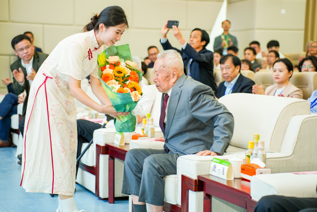大会现场,学生代表向蜂学专业奠基人龚一飞教授献花致敬,敬祝龚一飞教授百岁寿辰,感念其“一生只为蜂学一件事”的执着与奉献,表达了承其志、扬其德、传其业的信念与决心。中国农业科学院蜜蜂研究所授予学院“中国蜂业摇篮”荣誉牌匾,中国养蜂学会向龚一飞教授授予“中国蜂业泰斗”荣誉牌匾。