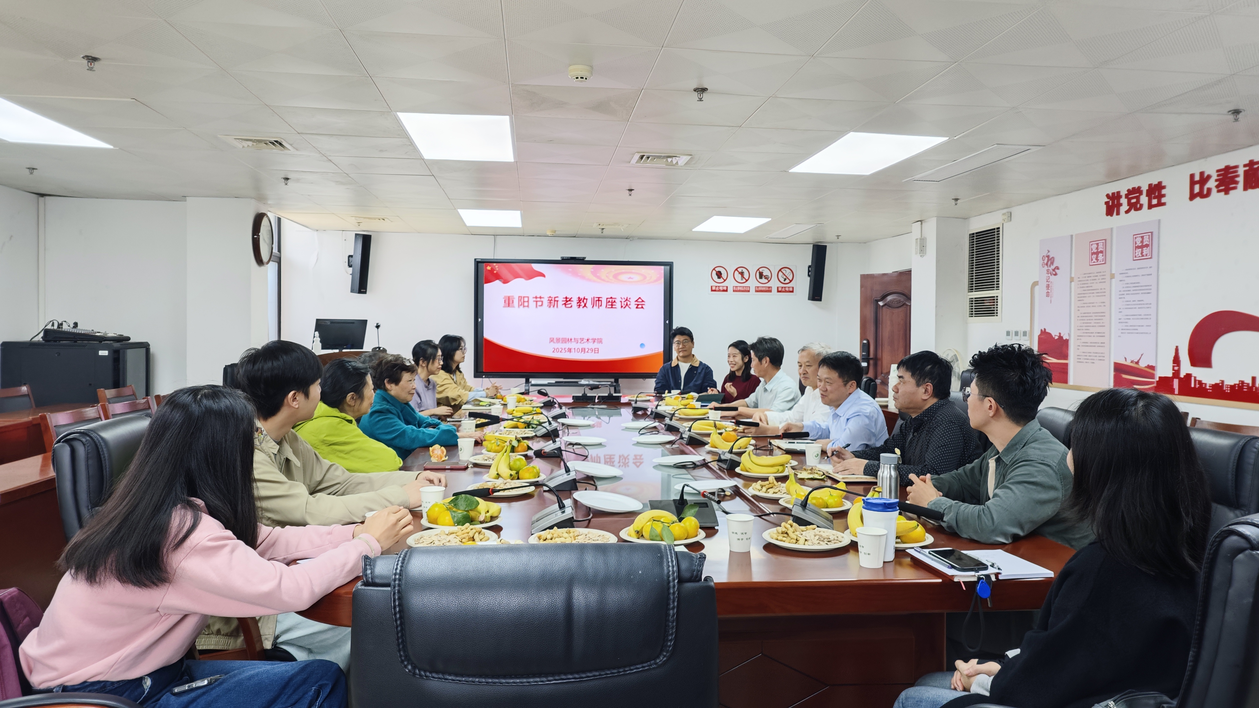 10月29日重阳节当天,风景园林与艺术学院在福州大学城校区仁德楼11楼会议室召开重阳节新老教师座谈会,学院班子成员,院关工委副主任林永英老师,委员李凌老师、陶萌春老师,退休老同志代表,新入职青年教师代表和院关工委秘书参加座谈。座谈会由院长彭东辉主持。