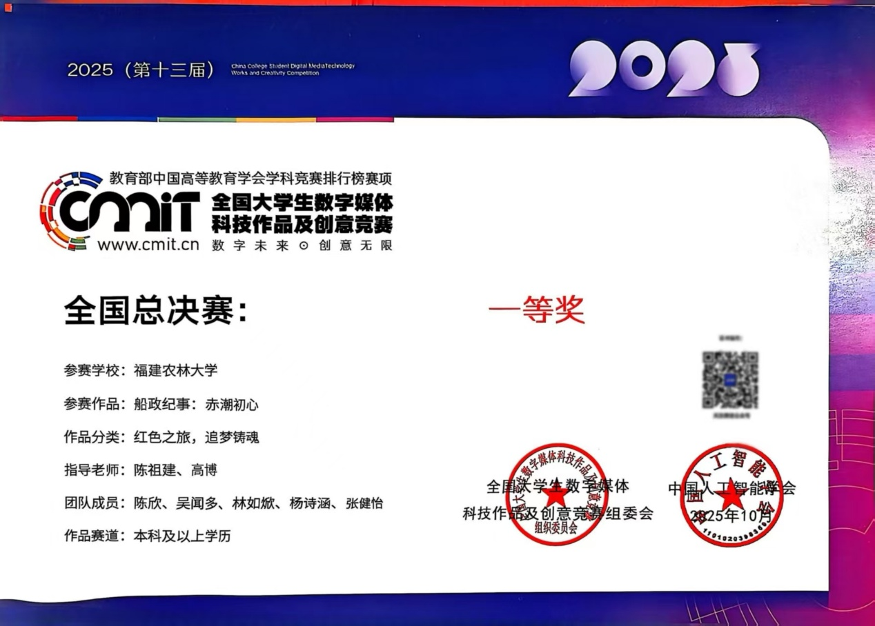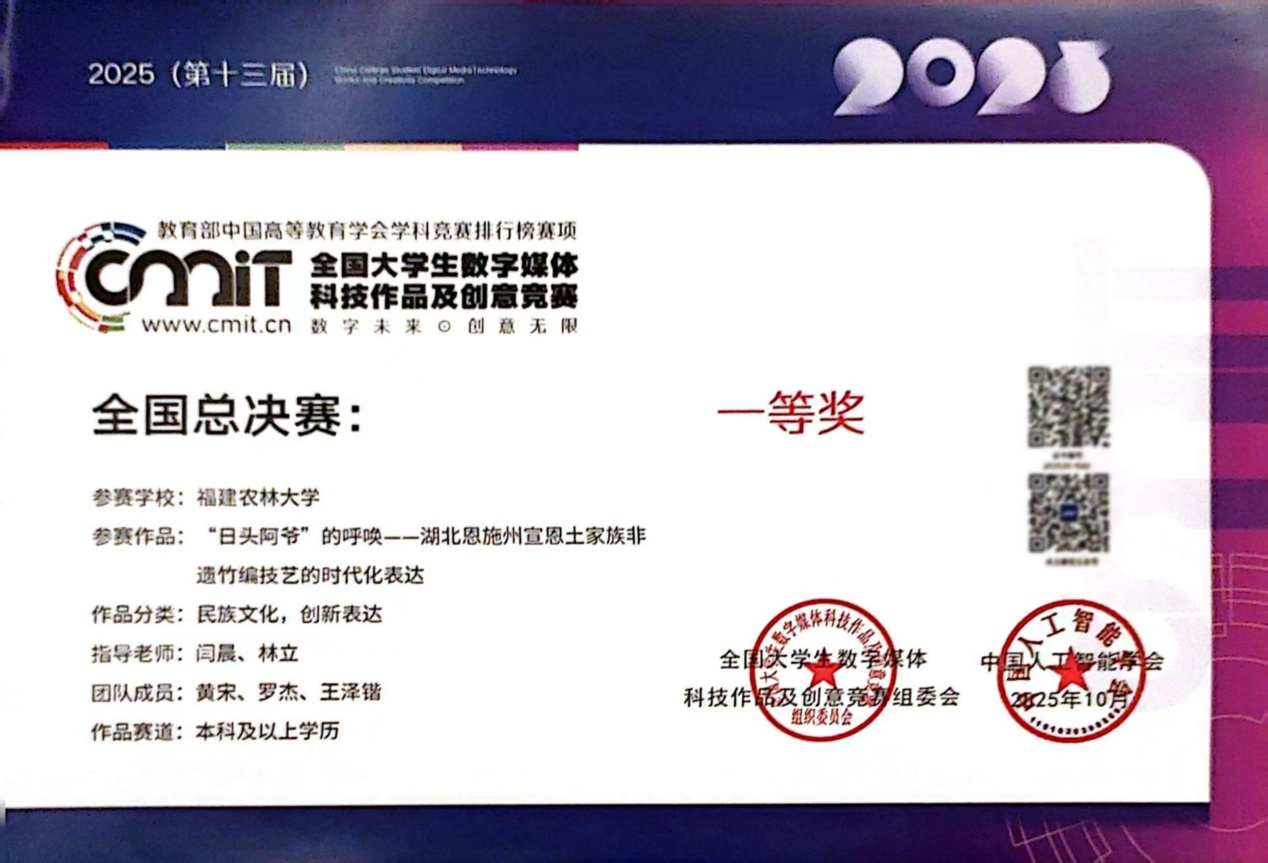 据悉,本届大赛共吸引国内外50万余名师生积极参与,累计提交作品17万件。经激烈角逐,来自全国1900余支学生团队的4800余名师生齐聚哈尔滨总决赛现场答辩。其中,福建省共有45件作品成功入围国赛,争夺全国一、二等奖。新葡京官网派出2支队伍前往哈尔滨参加全国总决赛,最终《“日头阿爷”的呼唤——湖北恩施州宣恩土家族非遗竹编技艺的时代化表达》(作者:黄宋、罗杰、王泽锴)及《船政纪事:赤潮初心》(作者:陈欣、吴闻多、林如焮、杨诗涵、张健怡)双双斩获全国一等奖;此外,新葡京官网另有11组参赛作品获得全国三等奖。指导老师陈祖建、高博、闫晨、林立荣获“优秀指导教师”。
