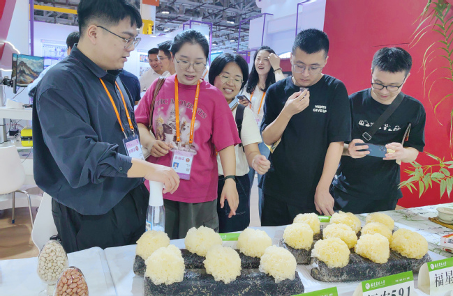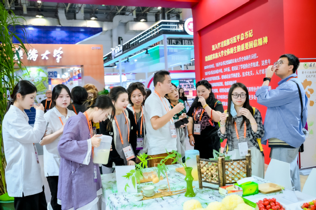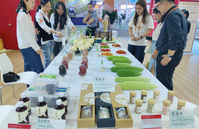 在新品种展区,安溪茶学院展示的茶叶深加工创意与衍生产品,茶粮食制品、茶休闲食品、茶化妆品、保健茶饮料等,体现茶与其他行业的有机结合,成功拓展了茶的边界,将传统农产品引领至一个更为广阔的高价值产业链中。园艺学院联合合作企业共同育成的多类特色优质苦瓜新品种,涵盖耐热越夏、耐低温设施栽培、鲜食水果型及深加工型等专用品类,果色丰富且营养品质显著提升,满足了多元化种植与消费需求。通过现代分子育种与传统杂交技术,成功育成多个高产、优质、抗病抗逆性强且早中晚熟配套的番茄新品种,果实颜色丰富,在提升风味与营养品质的同时,有效增强了稳产性与适应性,已创造显著经济效益,有力推动番茄产业品种升级。农学院选育的多色花生优质品种,具有高产、高油酸、抗青枯病、抗黄曲霉的特点。生命科学学院的银耳新品种‘HT108’,成为福建首个食用菌航天育种新品种。这款航天银耳的子实体呈黄色,朵型圆整紧致,耳片厚实且内卷,鲜重平均增产为10%以上,其鲜品的总黄酮、总多酚、粗多糖含量分别较‘古田银耳Tr21’提高60.0%、55.6%、13.7%,表现出丰产性高、活性成分含量高的特点。银耳精神加工技术应用示范成效显著,银耳多糖提取技术提高银耳附加值300%。