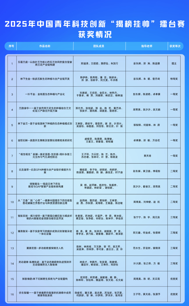 在“揭榜挂帅”擂台赛中,学校共16项作品获奖,夺得擂主(全国第1名)1项、特等奖1项、一等奖5项、二等奖3项、三等奖4项、优胜奖2项,总获奖数并列全国高校第32位。