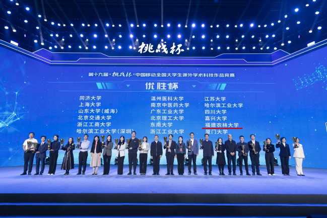 10月31日至11月3日,第十九届“挑战杯”全国大学生课外学术科技作品竞赛决赛、科创报国汇报会暨颁奖活动在南京大学举行。学校在主体赛、“揭榜挂帅”擂台赛、“人工智能+”专项赛共斩获国家奖25项,并以团体总分位列全国高校第36位的优异成绩捧得“优胜杯”,成为全国56所“优胜杯”高校中唯一一所农林类高校。学校高度重视“挑战杯”竞赛的育人价值,紧紧围绕立德树人根本任务和“双一流”建设目标,扎实推动科创育人工作,校党委书记赖海榕、校长兰思仁及相关校领导多次关心指导赛事组织工作,校党委副书记曾华平专程前往赛场,亲切看望并指导参赛师生。