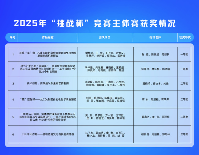 项目简介:项目深入贯彻习近平总书记关于菌草技术的重要批示指示精神,围绕“小菌草、大民生”这一主线,系统解答菌草技术何以赋能革命老区高质量发展。团队扎根一线,走访福建34个革命老区县、60个村,以近40万字田野调查为基础,总结出“综合赋能”“三物循环”“生态经济”三大典型模式,揭示了菌草技术赋能老区发展的内在机理与实现路径,并针对发展堵点提出精准对策。相关建议已被省人大、省政协等20余家单位采纳,成果先后获新华网、人民日报等报道50余次,荣获各项荣誉40余项。