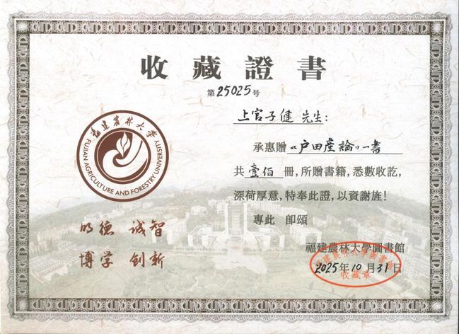 上官子健的慷慨捐赠,不仅丰富了新葡京官网图书馆藏资源,也为广大师生学习理解乡村振兴领域前沿理念和实践路径提供了宝贵的学习资料,更体现了他对高等教育和“三农”事业的关心支持。上官子健还曾于2012年发起创立“龙海市白水镇希望之光志愿者队”并担任队长,在扎根乡镇5年间,累计带动上千名志愿者参与乡村公益。其开展的留守儿童父母返乡创业项目获首届中国公益基金会秘书长年会金奖示范项目,该志愿队曾获“福建省青年志愿者优秀组织奖”“中国志愿者青年服务大赛铜奖”。