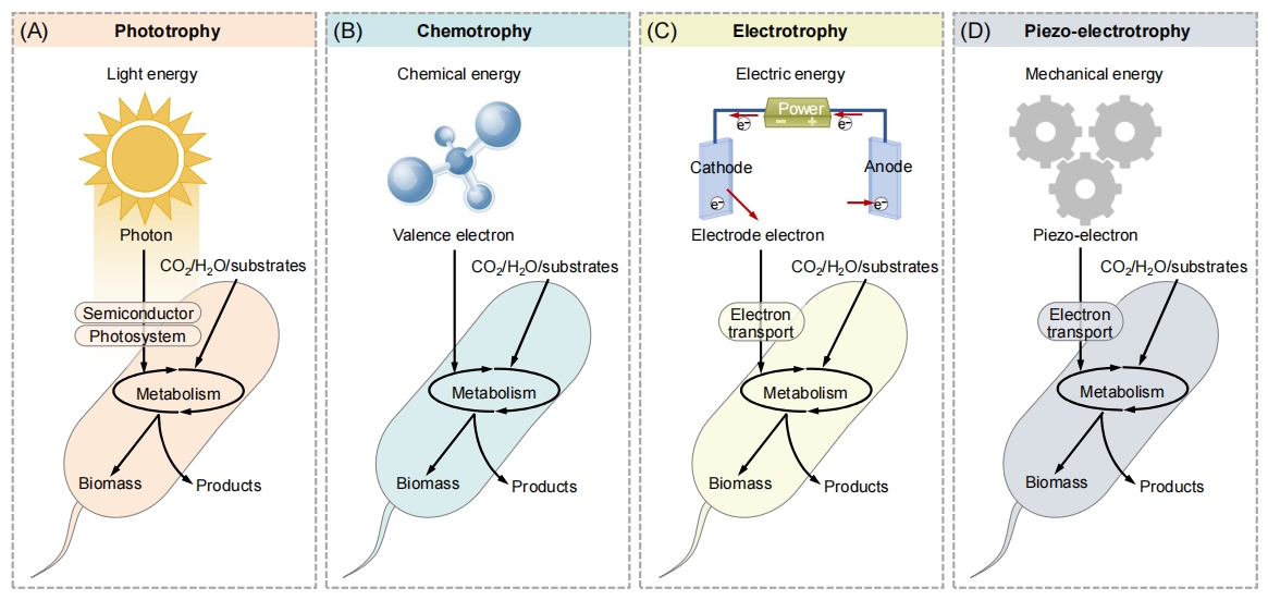自1888年俄国微生物学家维诺格拉茨基(Sergei Winogradsky)发现化能自养型微生物以来,对于生命活动的能量来源(即微生物从环境中获取能量)这一根本问题的探索,持续推动着微生物学的发展。迄今,光能营养型(phototrophy)、化能营养型(chemotrophy)是现代微生物教科书认可的微生物能量获取范式,深刻塑造了微生物生态学与代谢研究的格局。而电能营养型(electrotrophy)经过20年多发展,已被逐渐认可(图1A–C)。尽管对于上述三种能量类型的研究已经非常深入,它们仍可能未能涵盖微生物能量利用的全部策略。这一推测主要源于现有范式均存在特定的局限:光能营养型受光照可及性的制约,化能营养型依赖于有机物或还原性无机物的丰度,电能营养型则局限于人工电子源(如通有直流电的电极等)。