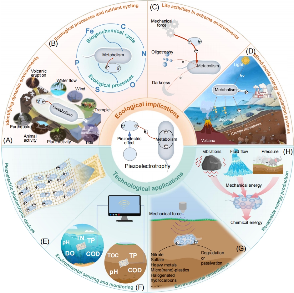 基于此,我们提出将压电营养型作为微生物能量获取的第四种范式,并将其定义为:微生物通过压电效应将环境机械能转化为电能,并用于驱动细胞代谢及生长存活的过程(图1D)。已有研究表明,机械能可通过压电材料转化产生电能,进而支持多种微生物代谢活动(图3)。压电营养型这一概念框架有助于弥补现有能量范式的若干不足:在光能营养型无法进行的黑暗环境、化能营养型受底物限制或电能营养型缺乏合适电子源的条件下,只要存在机械力,压电营养型便可能发挥作用。鉴于机械力的普遍存在,压电营养型策略或可使微生物在深海沉积物、地下岩石圈等极端环境中获得补充能量,从而拓展其生存边界。作为第四种能量获取范式,压电营养型不仅拓宽了对微生物能量来源的认识,将微生物能量利用从传统的光能化能,拓展到机械能(将机械运动与微生物联系起来),也为解释地球元素循环与生命起源提供了新见解。提供了新的视角(图4A–D)。此外,基于压电营养型原理的生物系统,未来也有望在生物电子器件、环境传感与监测、生物修复、能量收集以及植入式医疗设备等领域展现其应用潜力(图4E–H)。