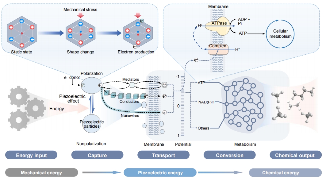 图2. 压电营养型中假定的能量流动模式。机械应力诱导压电材料产生表面极化电荷并建立电场,在含水环境中进一步驱动局部氧化还原反应,从而表现为负极区提供电子、正极区消耗电子并产生质子。电活性微生物捕获电荷,并通过导电纳米线、外膜细胞色素或可溶介质穿越微生物膜,建立膜电位和质子梯度。膜电位和质子梯度驱动ATP的合成和还原载体的生成,从而与细胞代谢整合以实现维持和生长。