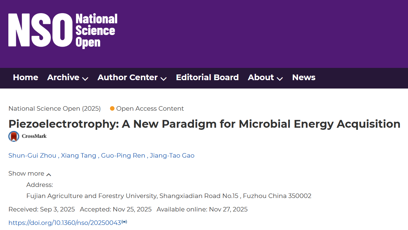 2025年11月27日,新葡的京集团350vip8888官网周顺桂教授团队在《国家科学进展》(National Science Open, NSO)在线发表了题为“Piezoelectrotrophy: A New Paradigm for Microbial Energy Acquisition”(《压电营养型:微生物能量获取的新范式》)的综述论文。该文率先提出将压电营养型视为继光能营养型、化能营养型和电能营养型之后的微生物能量获取新范式。文章首先构建了压电营养型的基本概念框架;进而探讨了该新范式对于理解细胞代谢及生态演化的重要意义;同时展望了压电营养型的潜在应用前景;最后,总结了该领域当前面临的研究挑战及未来的发展方向。