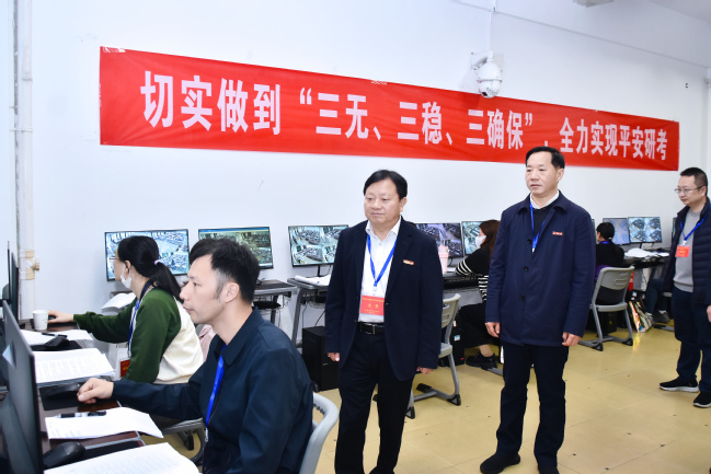 校领导重点检查了考生与考务人员通道设置、视频监控覆盖、后勤服务保障等关键环节,详细询问了考生应考、考场分布、试卷安全、监考人员配置及考场秩序维护等相关工作,通过视频监控系统仔细察看了考生安检流程、各考场考试情况,实地巡查了视频监考室和部分标准化考场,对考点的规范组织和平稳运行给予肯定,对全体工作人员的辛勤工作表示感谢。