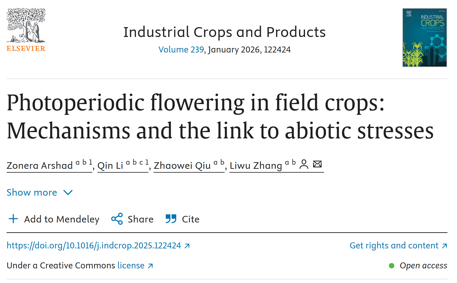 2025年12月09日, 新葡的京集团350vip8888官网张立武教授团队在国际期刊《工业作物与产品》(Industrial Crops &Products)在线发表了题为“大田作物光周期调控开花:机制与非生物胁迫的关联(Photoperiodic flowering in field crops:Mechanisms and the link to abiotic stresses)”综述论文,系统解析了作物光周期开花机制与逆境响应的内在联系。