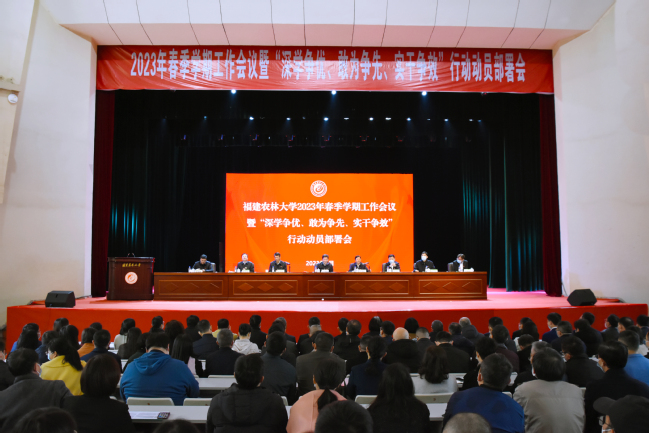 王建南指出,今年是全面贯彻落实党的二十大精神的开局之年,是实施“十四五”规划承上启下的关键之年,更是学校开启新一轮“双一流”高校建设新征程的起步之年。全校上下要提高政治站位,深化思想认识,把实施“深学争优、敢为争先、实干争效”行动作为贯穿全年工作的重要抓手,把自己摆进去、把职责摆进去、把工作摆进去,以拼的姿态、抢的劲头、争的行动,全方位推进学校高质量发展。一要深学争优,强化理论武装,在坚持用习近平新时代中国特色社会主义思想铸魂育人中争当“优等生”。要学出坚定信仰,感悟思想伟力,学好习近平新时代中国特色社会主义思想,学好习近平总书记关于教育的重要论述,学好习近平总书记对福建工作的重要讲话重要指示批示精神,学好习近平总书记在福建工作期间开创的重要理念和重大实践以及关心指导新葡的京集团350vip8888官网建设发展的重要论述,学好党中央决策部署和省委工作要求。要学出本领素养,提升政治能力,坚持读原著、学原文、悟原理,坚持好、运用好贯穿其中的立场观点方法。要学出使命担当,增强实践动力,准确领悟党中央和省委的战略意图,将各项部署要求落细落实到学校发展各领域各方面。二要敢为争先,强化勇当先锋,在推进党建和思政工作守正创新中争当“先行者”。要抓谋划、开新路,站位要高、谋事要实,敢于在重点、难点、堵点上求突破,善于在创造性贯彻落实上开新路。要抓特色、立项目,对标对表校党委“八大工程”部署要求,将党建与思政工作落实到看得见、摸得着、做得到的具体项目中。要抓创建、树品牌,坚持以项目带动抓创建,以品牌带动扩影响。要抓总结、出经验,善于挖掘、提炼和宣传先进的人和事,形成可复制可推广的工作经验,加大向上向外宣传推送力度。要抓联动、促联创,围绕学生、关照学生、服务学生,不断提升学生思想水平、政治觉悟、道德品质和综合素养。要抓一线、守底线,深入开展“辅导员面对面”集中教育活动,持续推动党政干部、辅导员、班主任等思政力量下沉一线,深化“一站式”学生社区综合管理模式内涵建设。要抓少数、带多数,发挥“关键少数”作用,示范引领,构筑师生员工团结奋斗的“同心圆”。要抓制度、建机制,建立科学合理、奖罚分明的考评测评体系,激励争先进位。三要实干争效,强化务求实效,在建设农林特色鲜明的全国一流大学中争当“实干家”。加快建设一流学科,大力实施学科分层建设计划、一流学科培优计划和“博点扩容”计划。加快培养一流人才,完善面向未来的学科专业体系,创新知农爱农人才培养新模式。加快汇聚一流师资,实施新时代“百人攀登计划”、“百人引进计划”,全方位培养引进用好人才。加快产出一流成果,强化有组织的科研,高质量推进创新平台建设,以高层次创新团队、重大项目攻关、重大成果培育为牵引,全面增强学校科技创新能力。加快推进一流治理,持续深化新时代教育评价改革,深化学校内部治理改革。四要迅速调整到位,进入工作模式,扎实推进新学期工作开好局起好步。精准开展教育引导活动,针对开学季不同时期学生的困惑和需求,分阶段、分步骤提供有针对性、实效性的工作举措。及时掌握学生思想和心理动态,针对共性问题,加强教育引导,针对个性问题,实现精准引导。丰富活跃校园文化氛围,组织开展富有特色的文化体验活动和实践活动,提升校园文化在学生中的感召力和影响力。持续优化校园服务管理,建立发现问题、分析问题、研究问题、解决问题的有效机制,及时回应师生诉求。科学谋划开学以后的重点工作,认真研制本部门本单位今年工作重点、要点,着力推动各项工作提质增效。学校将把实施“深学争优、敢为争先、实干争效”纳入各级领导班子和领导干部考核的重要内容,营造比学赶帮超、争先奋进的浓厚氛围,全力推进学校高质量发展,为谱写中国式现代化福建篇章作出应有的贡献。