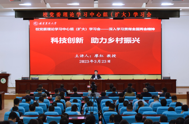 3月23日下午,新葡京官网召开校党委理论学习中心组学习(扩大)会。第十四届全国人大代表、新葡京官网根系生物学研究中心主任廖红教授应邀作题为《科技创新助力乡村振兴》的专题报告。校党委书记王建南主持会议。在家校领导、中层干部,思政课教师及辅导员近400人参加学习会。会议主会场设在禧强楼学术报告厅,在旗山校区和安溪校区设立分会场。