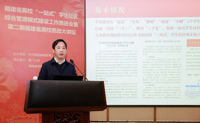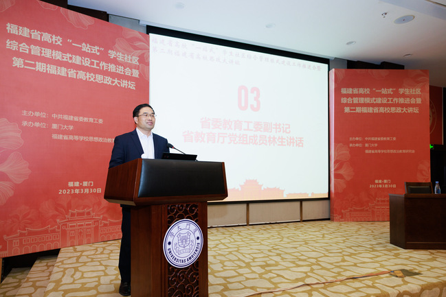 3月30日,由中共福建省委教育工委主办、厦门大学承办的全省高校“一站式”学生社区综合管理模式建设工作推进会暨第二期全省高校思政大讲坛在厦门大学翔安校区召开。省委教育工委副书记、省教育厅党组成员林生出席会议并讲话,各设区市委教育工委分管领导、各省(部、厅)属普通高校分管领导及相关职能处室负责人、辅导员等通过线上线下相结合方式参会。新葡京官网党委副书记曾华平代表学校作交流发言。